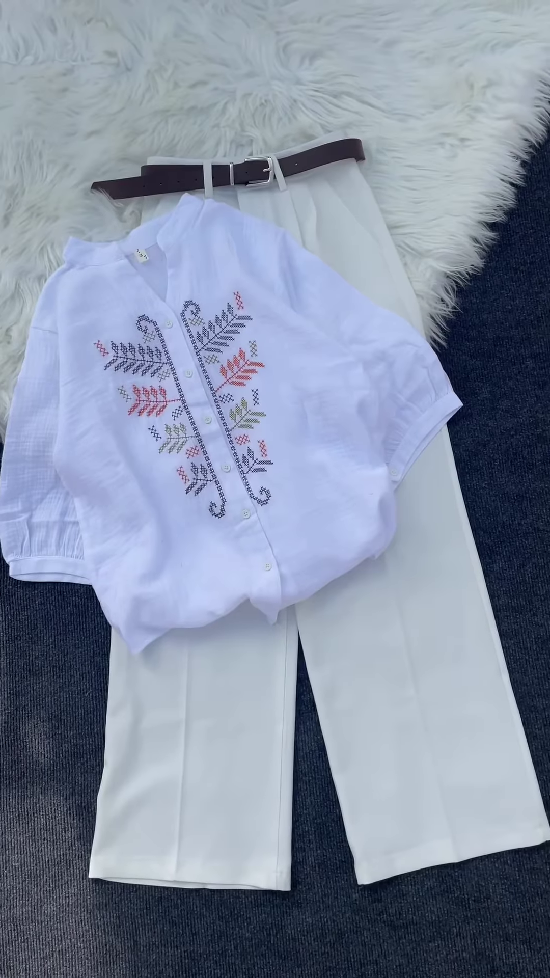 Styled over classic white pants with a brown belt, this ensemble is ideal for boutique displays, catalog shoots, or WhatsApp fashion campaigns.