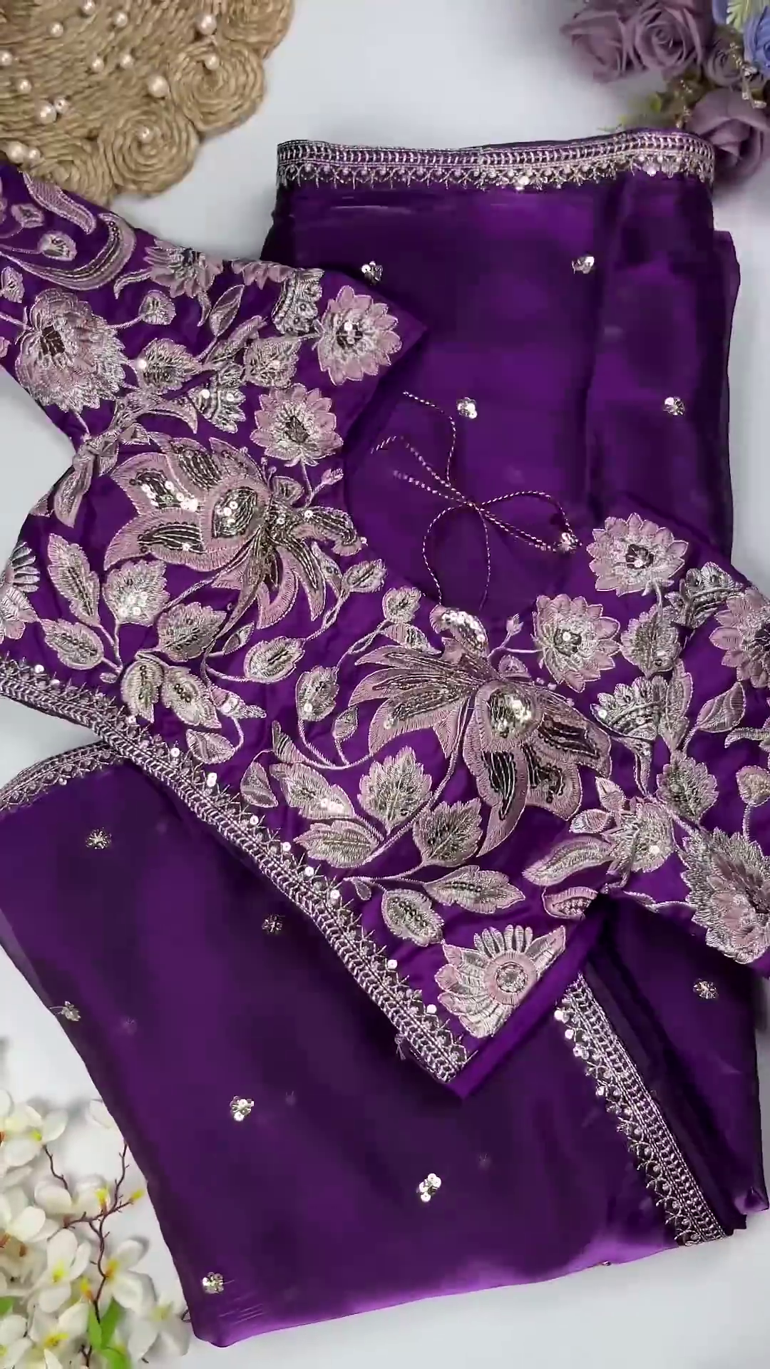 Embrace royal sophistication with this exquisite purple designer blouse set. Meticulously crafted for a majestic ethnic silhouette, this ensemble combines dense floral artistry with shimmering details, ensuring a grand presence at any high-profile event.