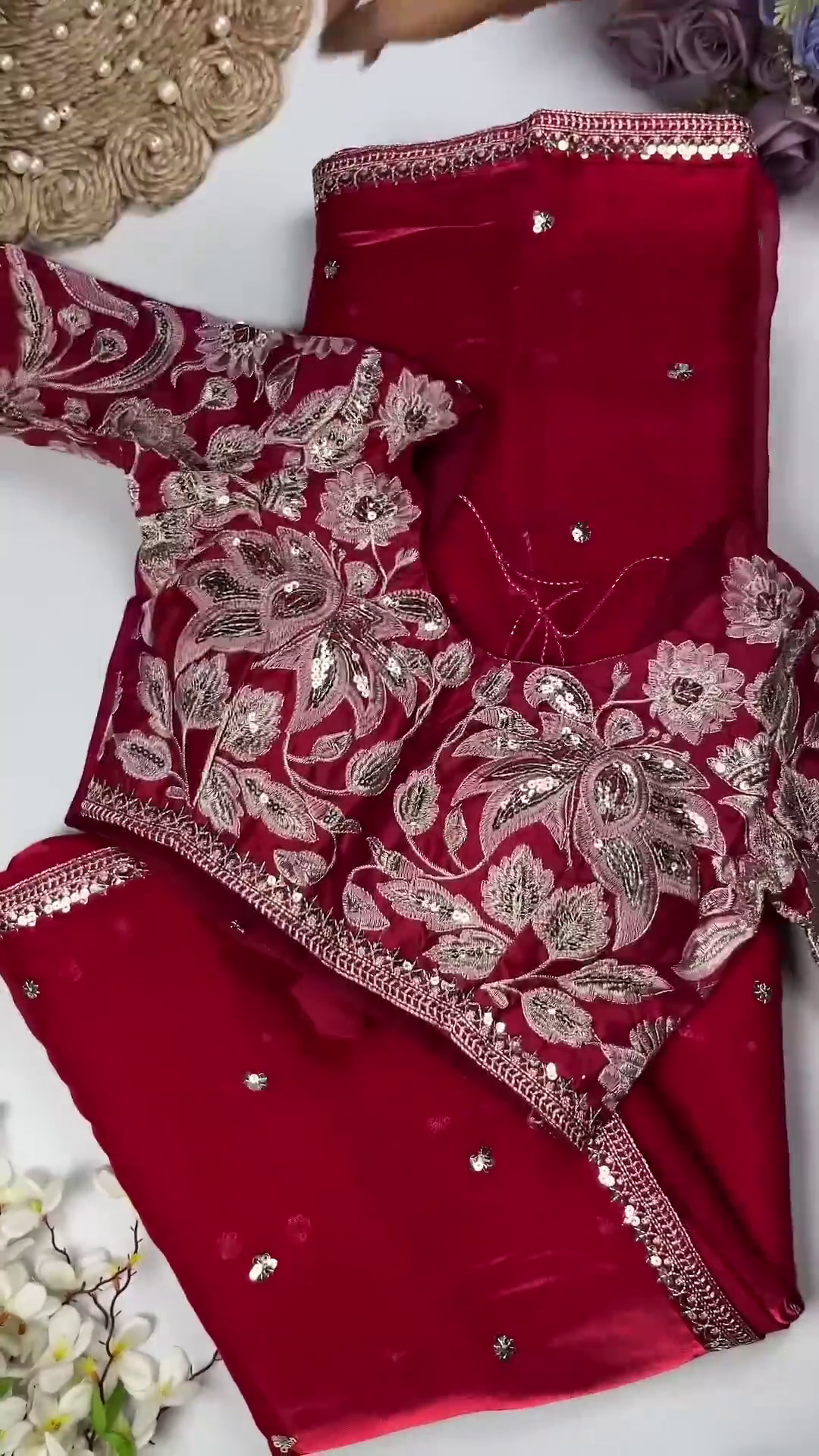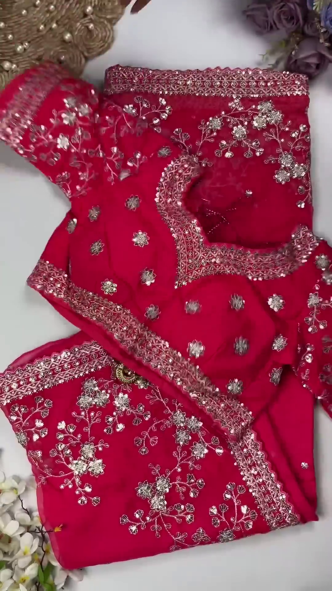 ✔️ Dense Floral Work: Close-ups showcase the rich, multi-layered thread and sequin embroidery covering the entire blouse.